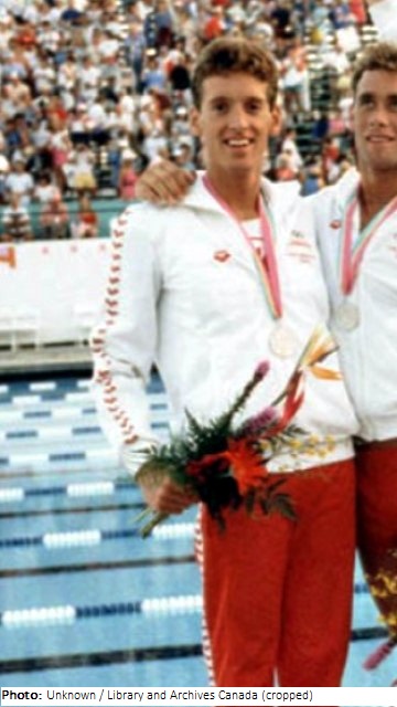 Mike West had been swimming for fun since the age of seven, but did not take it up as a competitive sport until in 1977. Specializing in the backstroke, he made the Canadian national team in 1980, but did not participate in that year’s Summer Olympics, as Canada boycotted the Games. His first major international victory came at the 1982 Commonwealth Games, where he won the 100 metre backstroke and took bronze in the 200 metre version. He repeated his gold medal feat at the 1983 Summer Universiade and finished third in both the 100 and 200 m backstroke events at that year’s Pan American Games. His talents then took him to the 1984 Summer Olympics, where he captured bronze in the 100 m backstroke and earned silver in the 4x100 metre medley relay (alongside Victor Davis, Sandy Goss, and Tom Ponting). He also placed second in the B Final and tenth overall in the 200 m backstroke. He went on to win a pair of silver medals, in the 100 and 200 m backstroke events, at the 1985 Pan Pacific Games, before moving on to the 1986 Commonwealth Games, where he earned bronze in the 100 m and gold in the 4x100 m relay (with Baumann, David, Goss, Ponting, Mark Tewksbury, and the non-Olympians Claude Lamy and Darcy Wallingford). He left the national team after this tournament to concentrate on his studies at the University of Waterloo. He eventually earned a medical degree from Queen’s University and, as of 2013, works as a physician in Dundas, Ontario. He was made a member of the Ontario Aquatic Hall of Fame in 1995.
