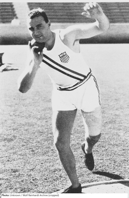Having twice set world indoor records early in 1932, Leo Sexton came within two inches of the outdoor record in winning the 1932 Olympic title. One month later he became the holder of both the indoor and outdoor records with a put of 53-0½ (16.17) at the Nassau Fireman’s Games at Freeport, Long Island. Sexton, a Georgetown grad, won the IC4A title in 1929 and to his 1932 AAU title he added two AAU indoor championships. As befitted his physique – he stood 6-4 (1.93) and weighed 240 lbs. (109 kg.) – Sexton began his career as a weight thrower, and he was the AAU indoor 56 lb. weight champion in 1932. Despite his build, Sexton was a finely coordinated athlete and in 1929 he cleared 6-4 in the high jump. Leo Sexton later had a successful insurance career, eventually becoming vice-president of a company in his hometown of Perry Oklahoma.
